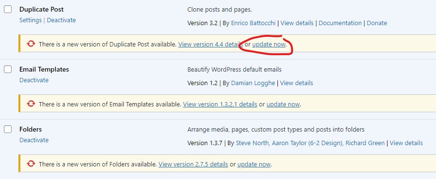 The above alert shows that 15 plugins need to be updated. Click ‘Plugins’ and you will see a list of the plugins that are used and a notice asking you to update. Click the ‘update now’ link to update the plugins to the latest version